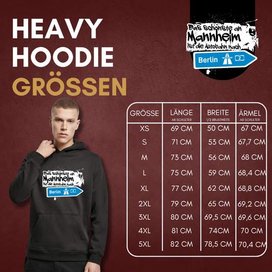 "Das schönste an Mannheim ist die Autobahn nach Berlin" Heavy Hoodie in 2 Fabren