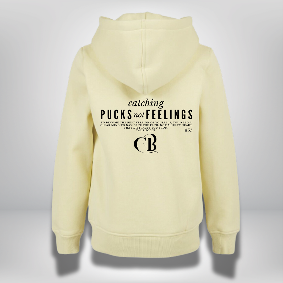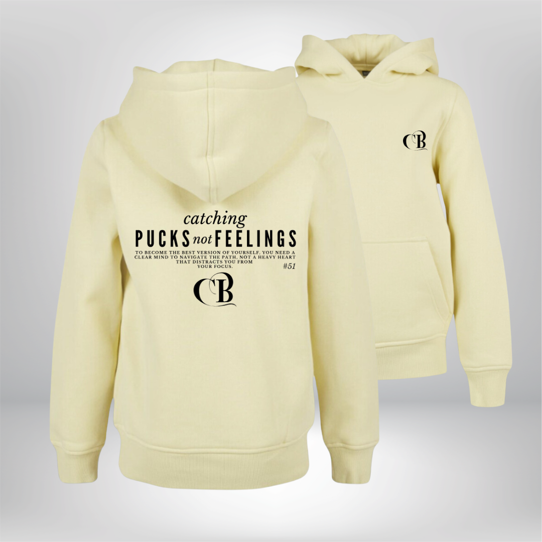 Der Hoodie in der frischen Farbe Soft Yellow kombiniert Komfort mit Stil und ist ein echter Hingucker. Der prägnante „Catching Pucks Not Feelings“-Print auf der Brust zeigt die richtige Einstellung: Immer fokussiert, egal ob auf dem Eis oder im Alltag.