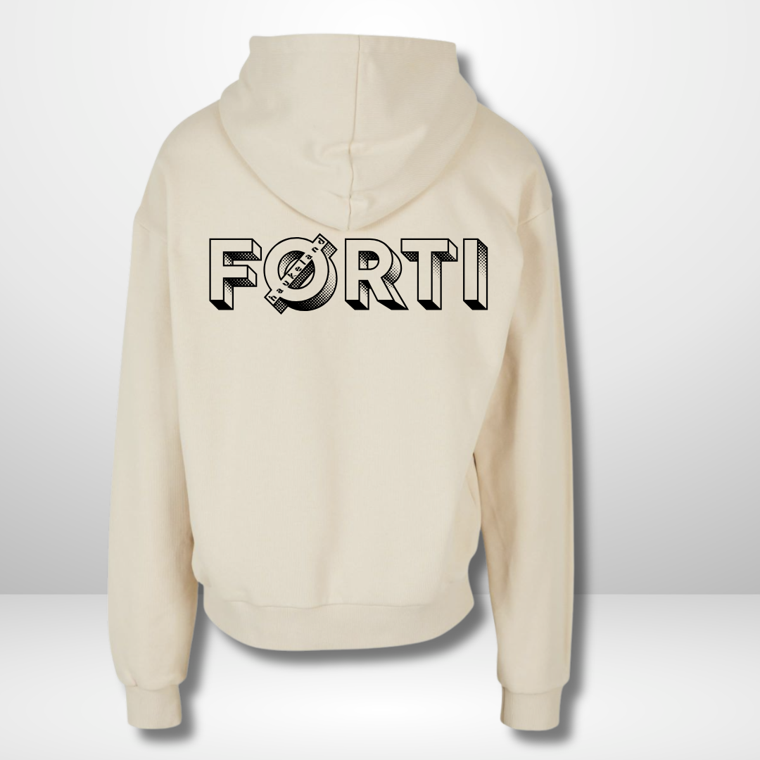 Der neue Hoodie kommt in sand mit großem FØRTI Rückenprint und einem kleinen, cleanen Detail im Nacken.
