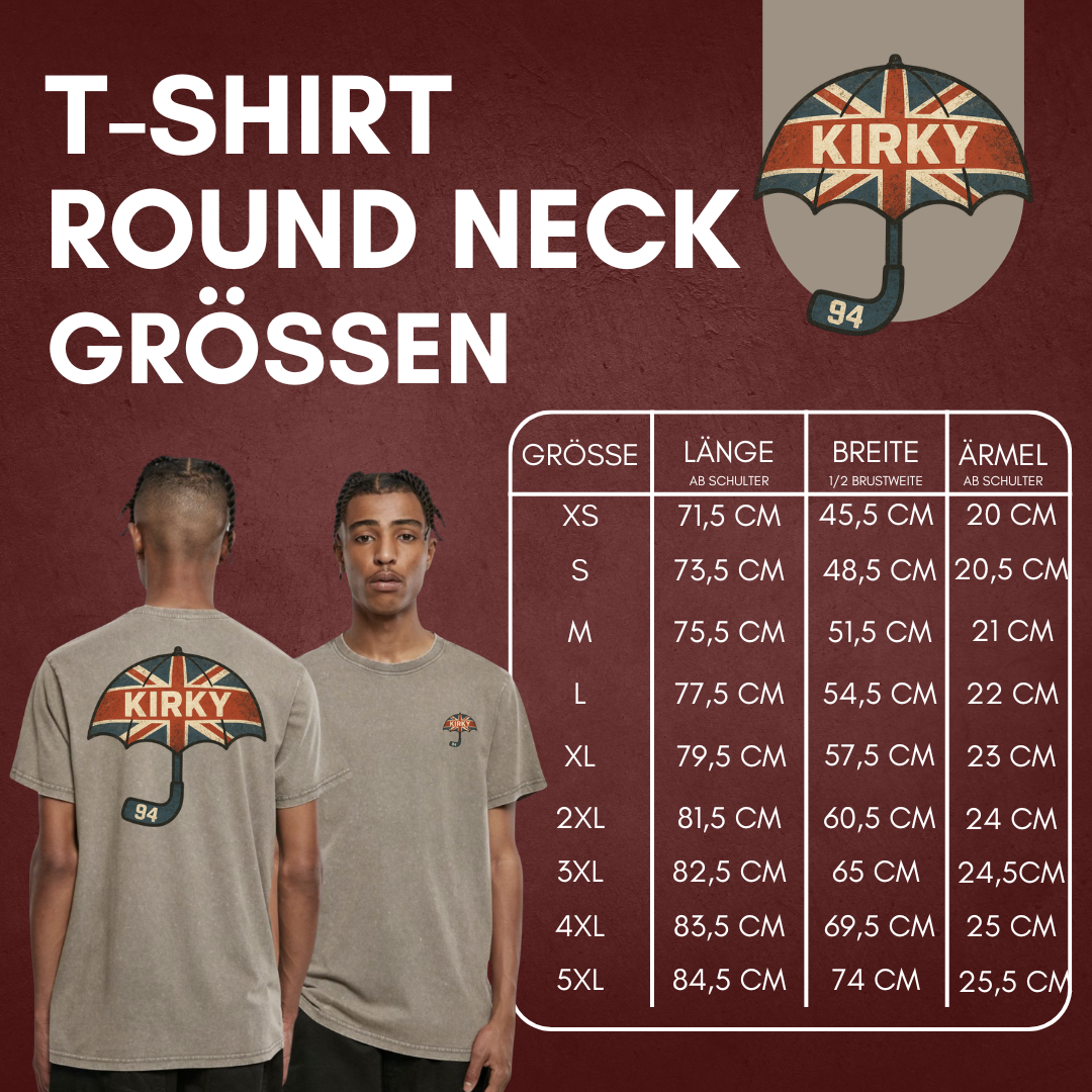 Brit-Style Umbrella Backprint, leicht vintage used, getragen auf einem Acid Washed Tee mit dem perfekten entspannten Fit. Jedes Stück hat durch die Waschung einen leicht individuellen Look – kein Shirt wie das andere.