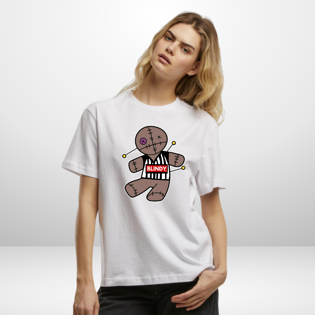 Pfeif dir das mal rein! Unser weißes „BLINDY“ Ladies Shirt ist die ultimative Antwort auf jede fragwürdige Schiri-Entscheidung. 😏⚡ Die legendäre Voodoo-Puppe auf der Brust steckt voller Nadeln – ein kleiner „Glücksbringer“ für den nächsten Spieltag. Und als krönender Abschluss? Der ironische Schriftzug „BLINDY“ auf seinem Trikot – weil der Schiri ja immer schuld ist! 🙃