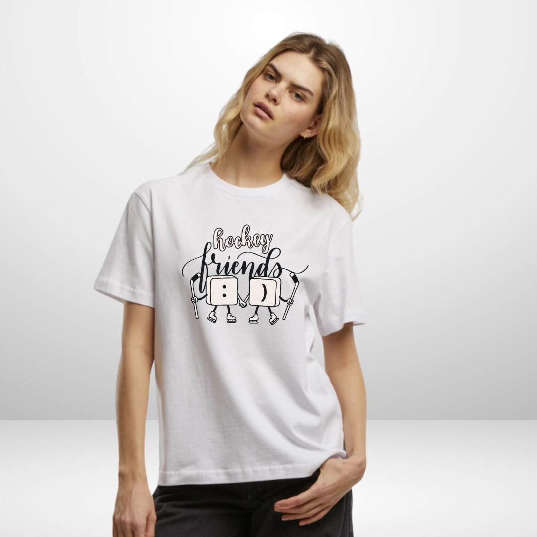 Das "FRIENDS" T-Shirt für Ladies vereint alles, was eine echte Hockeyfreundschaft ausmacht: Zusammenhalt, Spaß und Vertrauen – auf und neben dem Eis. Der liebevoll gestaltete Brust-Print aus ":" und ")" bringt das auf den Punkt: ein Lächeln, das verbindet. 😄💞