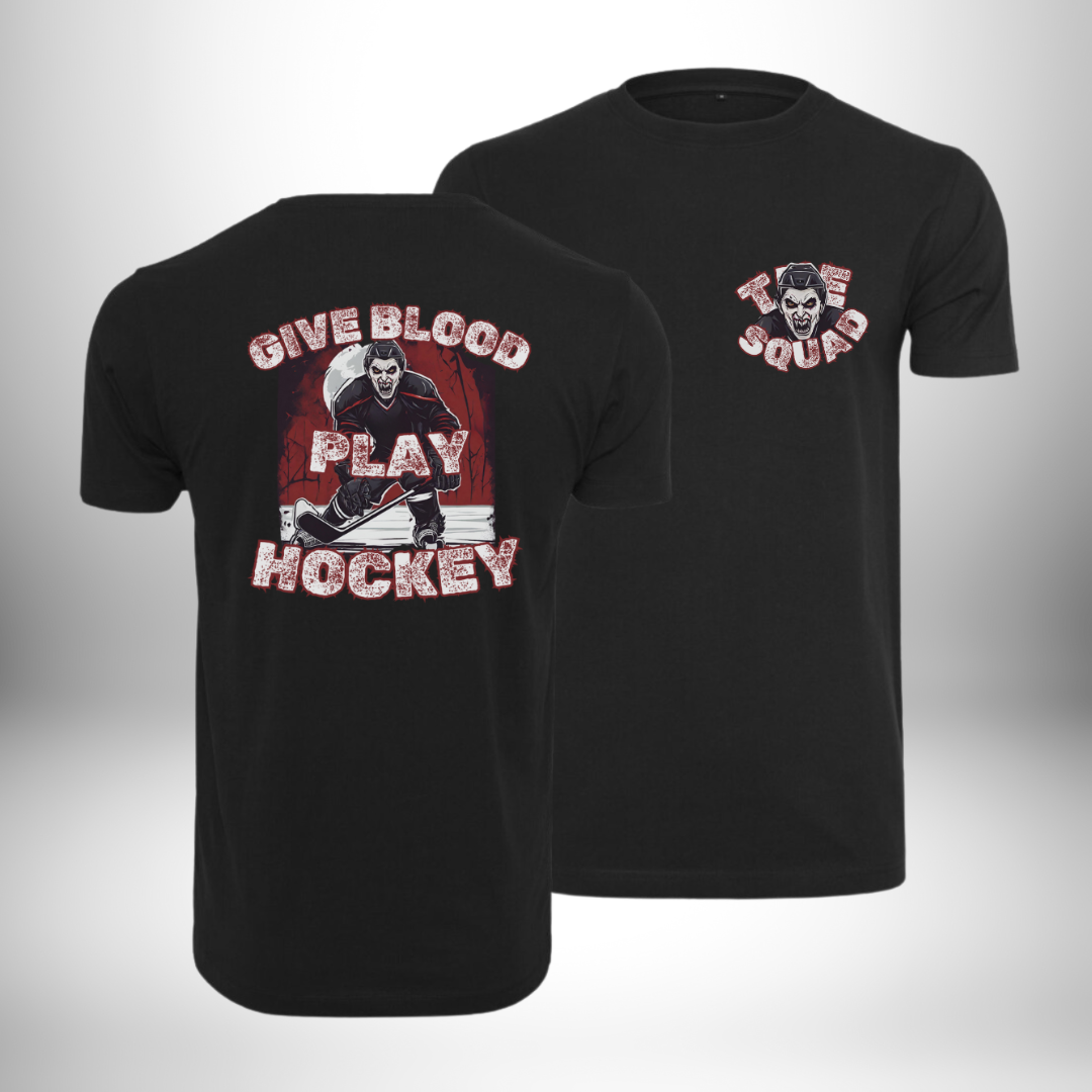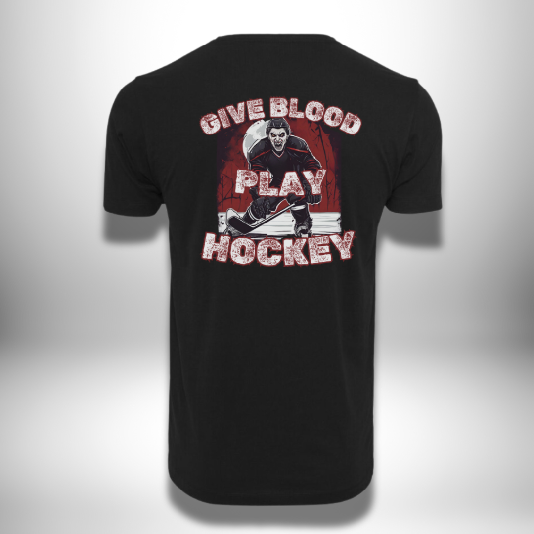 Blut, Schweiß und Leidenschaft – Eishockey fordert alles, und das macht es so besonders. Mit unserem "Give Blood – Play Hockey" T-Shirt bringst Du diesen Spirit auf den Punkt. Das auffällige Design zeigt einen Vampir, der Eishockey spielt – ein augenzwinkernder Hinweis darauf, wie viel Einsatz dieser Sport verlangt.