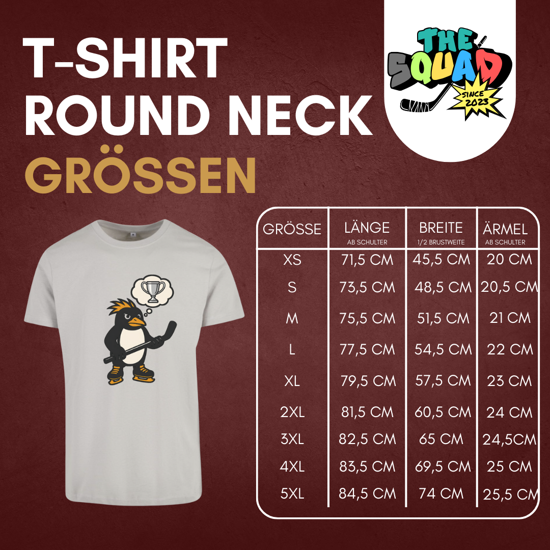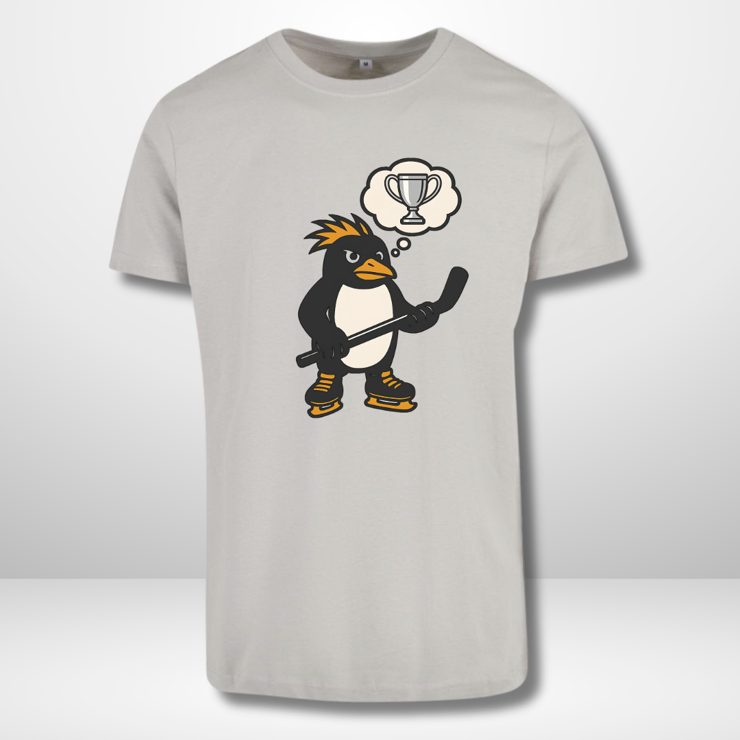 Vorne ziert ein entschlossener Pinguin 🐧 mit Hockeyschläger 🏒 das Design – der Pokal im Kopf zeigt: Große Träume starten klein.