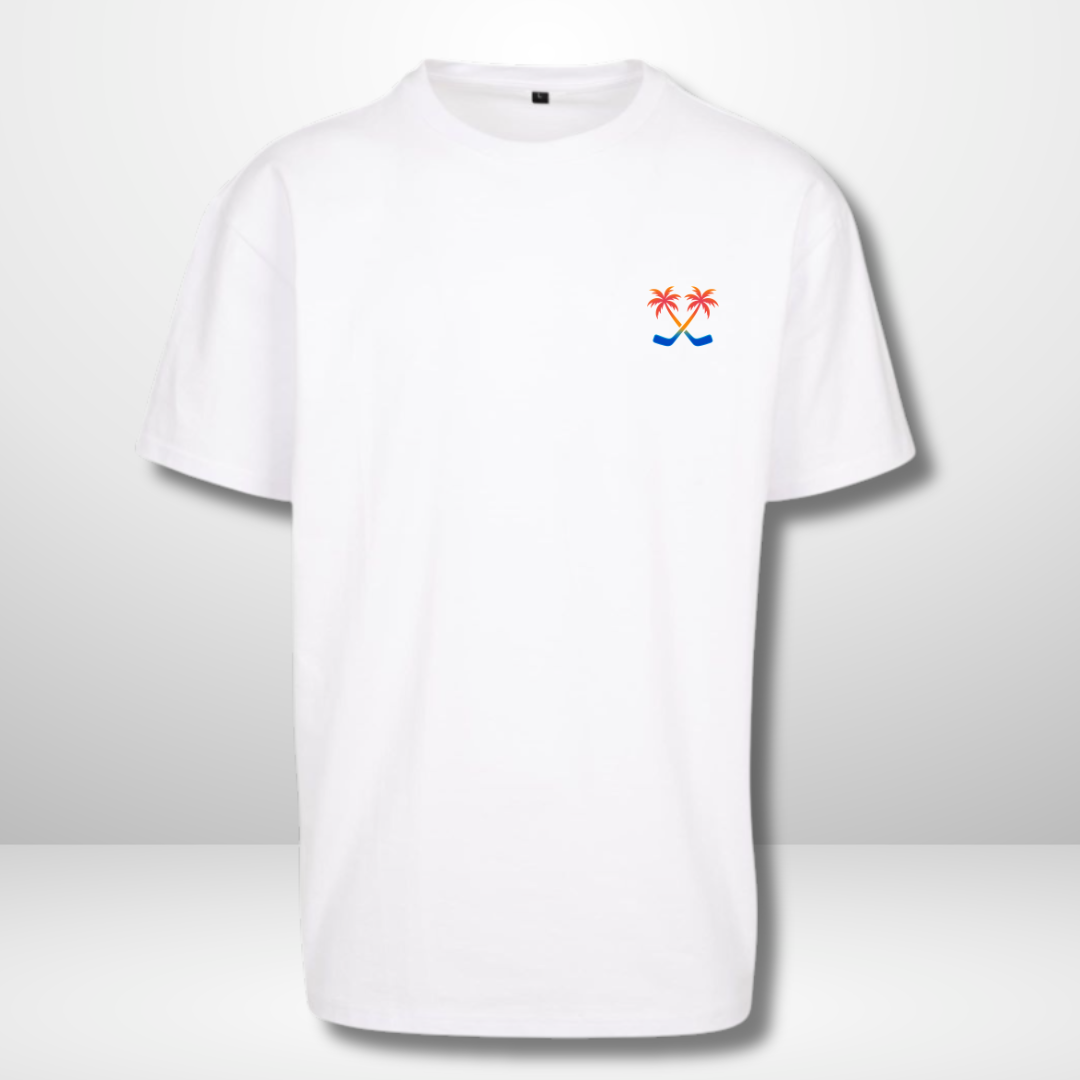 Vorne ein dezentes Hockeypalmen-Logo auf der Brust, hinten ein fetter Backprint mit gekreuzten Hockeypalmen 🌴🏒☀️