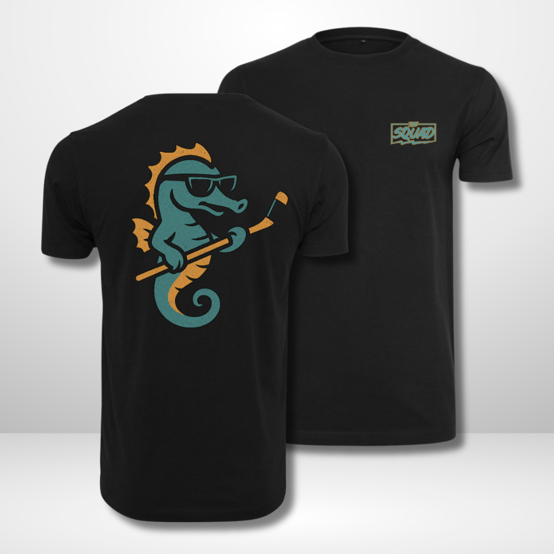 🧊 Auf dem Rücken: ein lässiges Seepferdchen mit Sonnenbrille, das ganz entspannt einen Hockeyschläger in der Flosse hält.🏒 Auf der Brust: das farblich passende The Squad Logo – dezent, stylisch und kindertauglich.