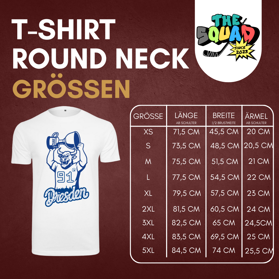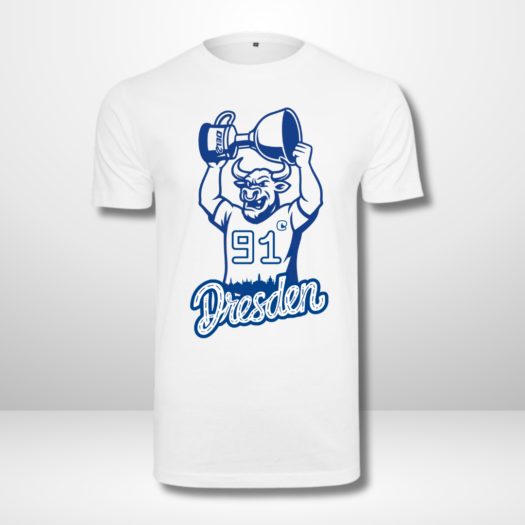 Feier mit uns – stilvoll, laut und stolz! Dieses weiße Everyday-Shirt zeigt Travis Turnbull als kraftvollen Bullen, der die Trophäe in den Händen hält – ein echtes Statement für alle Eishockeyfans und Dresden-Supporter.