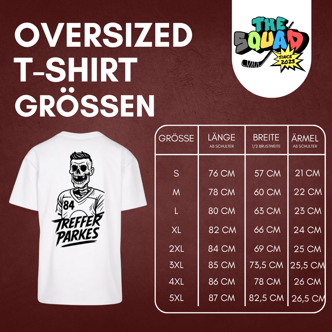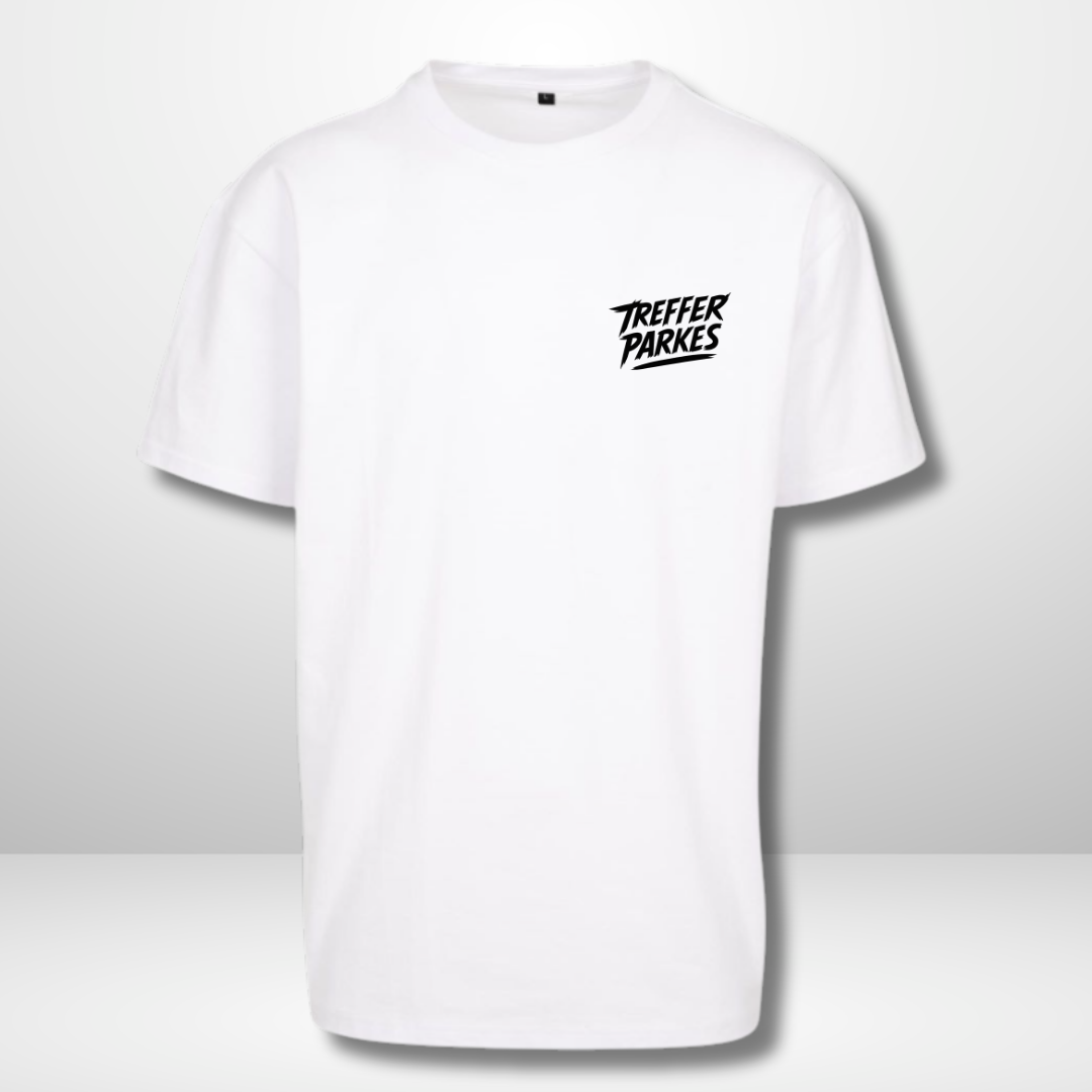 Ein oversized Shirt in Weiß, vorne mit einem kleinen „Treffer Parkes“-Schriftzug, hinten mit einem fetten Cartoon-Backprint – locker, laut, unverwechselbar 🎯🥅